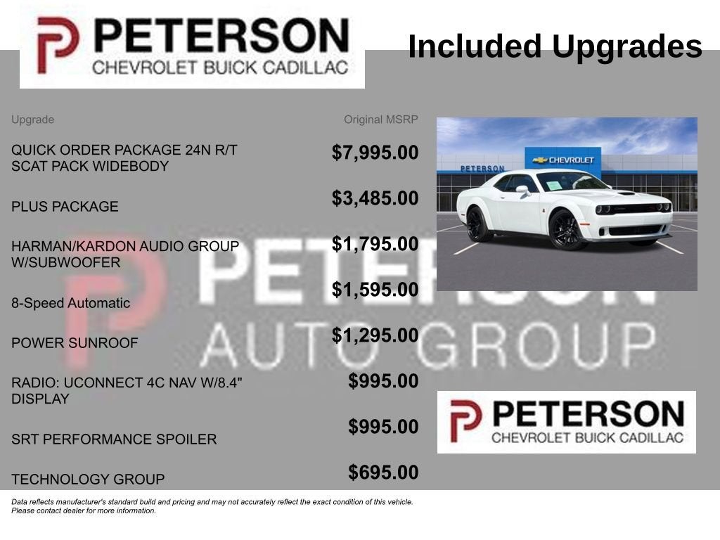 Dodge provides premium peace of mind with a rearview camera, rear parking sensors, electronic stability control, hill start assistance, traction control, tire-pressure monitoring, ABS, advanced airbags, and more. A joy to drive, our Challenger R/T Scat Pack Wide Body is just waiting for you! Save this Page and Call for Availability. We Know You Will Enjoy Your PETERSON CHEVROLET Test Drive Towards Ownership! Call us today 208-323-5000 to schedule your VIP test drive!